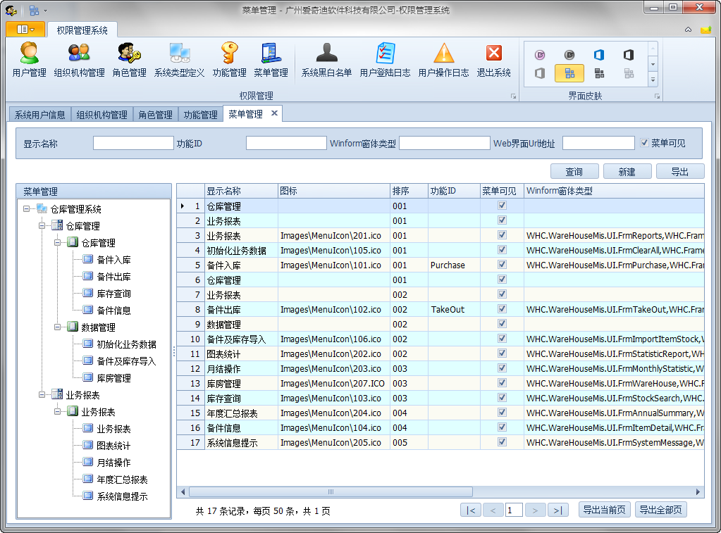 设定好菜单的图标和Winform窗体类型,就能在Winform框架中动态构建菜单信息了。菜单的图表放置在系统的相对目录下即可。